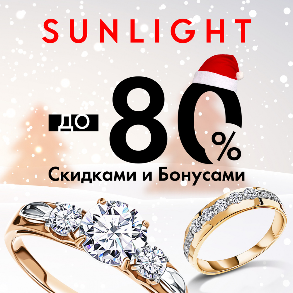 Порадуйте себя, друзей и своих близких. В салонах SUNLIGHT предновогодняя распродажа – скидки до 80% на все! Действует акция 1=2! Второе украшение или часы из специального ассортимента в подарок! А также успейте потратить бонусы SUNLIGHT. Оплатите ими до 30% стоимости украшений. Еще никогда подарки не были такими притягательными!